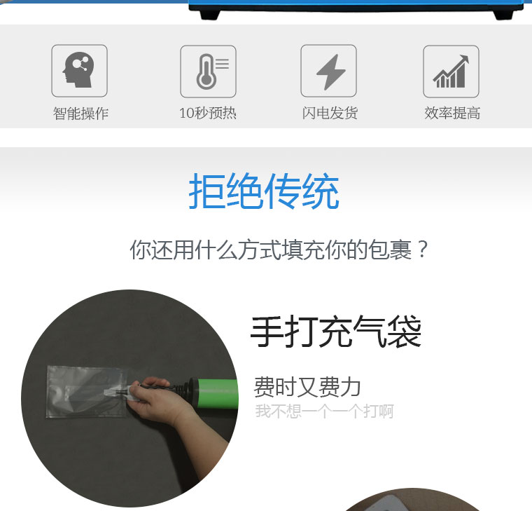 經典(dian)型氣墊系統的核心加(jia)熱技術(shu),使設備達到良好的薄膜密封效(xiao)果,避免空(kong)氣泄漏;空(kong)氣袋即使儲(chu)放1個月,體(ti)積仍能(neng)維持80%以上。