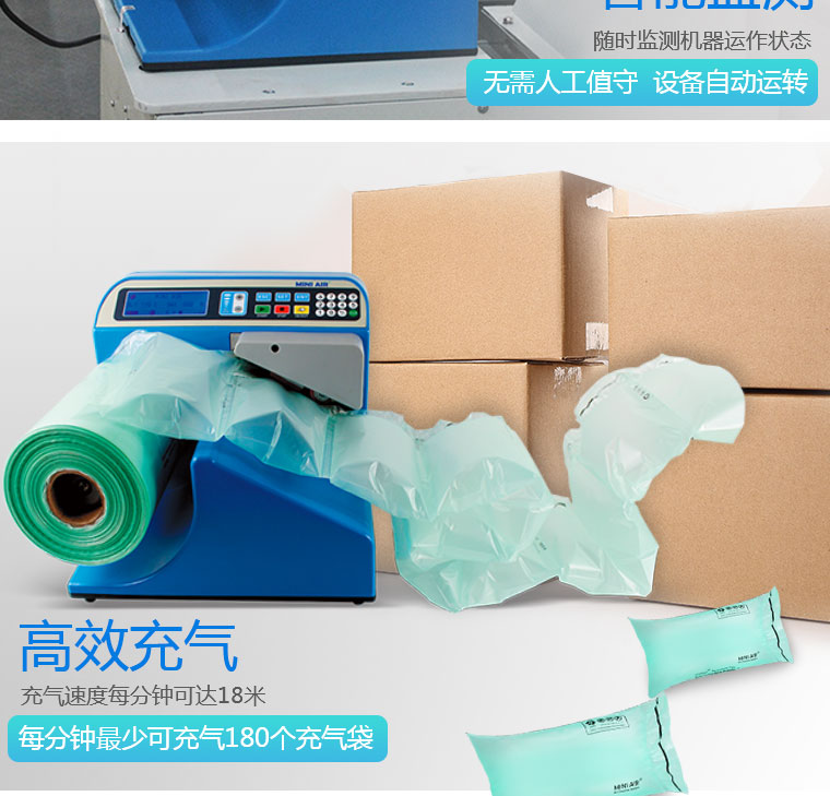 智能化(hua)操作界(jie)面,LED屏(ping)顯,可根據所(suo)(suo)使用薄(bo)膜的類型和每個包(bao)裝所(suo)(suo)需(xu)要的氣(qi)(qi)墊數量來調(diao)節機器的運(yun)行時(shi)間(jian),智能化(hua)感應環境(jing)溫度自行調(diao)整充氣(qi)(qi)熱封參數以(yi)達到(dao)優質的充氣(qi)(qi)效果。